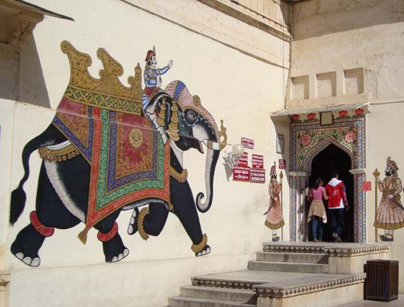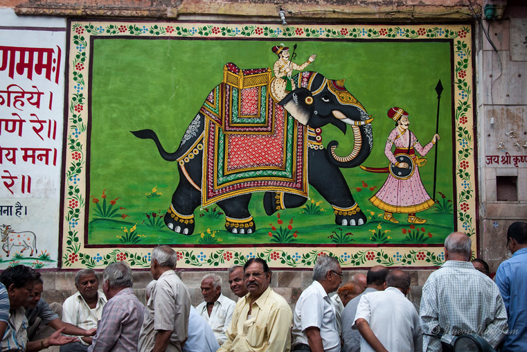 On several places in northern india you find wallpaintings of elephants made by native artits on historical buildings. The painting in the collection is a similar painting on silk bought 1990 in New Delhi on the local market.